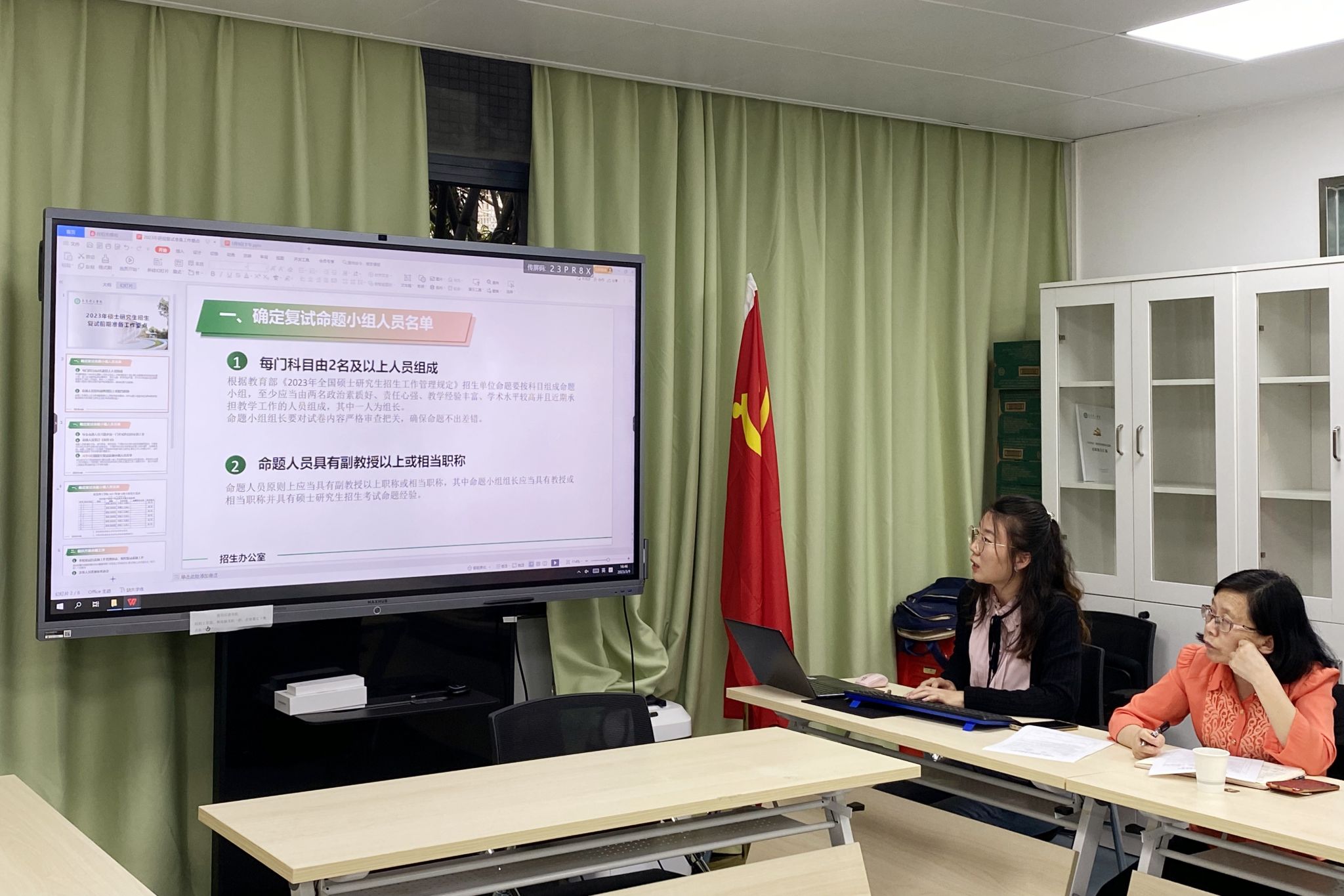 学院研究生招生负责老师逯瑶传达了学校2023年研究生招生录取工作布置会的相关文件精神和进度安排。