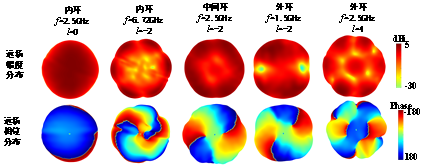 (3)提出了一种基于多环嵌套圆环贴片结构的同频多模、多频同模涡旋电磁波天线,推导出OAM模式与工作频率、馈电位置角度和贴片尺寸等参数之间理论关系式,以及多模的共同工作频率与单模工作频率的理论关系式。设计了三环嵌套圆环贴片天线,如图3所示,可以同时在2.5GHz产生OAM模态为0、-2和4,以及在1.5GHz、2.5GHz和6.72GHz产生模态为-2的涡旋电磁波。本文开展双环和三环嵌套圆环贴片天线加工、测试工作,实验结果与理论分析、仿真结果相吻合,进一步验证了多环嵌套圆环贴片天线的有效性,上述研究成果已发表在SCI期刊IEEE AWPL, 23, 11, 3451-3455, 2024.(Yang Yang, Fei Shen, Lelan Tian, Baiyang Liu).