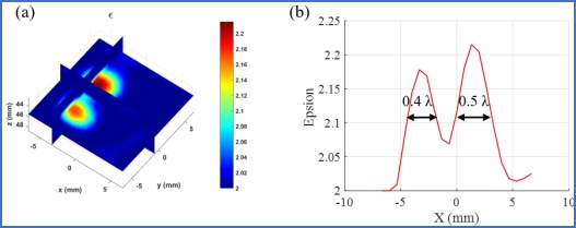 (1)2020年,提出利用涡旋电磁波对碳纤维复合材料内部损伤进行反演检测。研究结果表明,对于二维目标,反演精度可达1/10波长,三维目标的分辨率也可达到1/2波长。图8给出了涡旋电磁波照射下碳纤维复合材料内部多目标二维反演结果,即当采用12个OAM模式时,反演结果可以清晰的分辨出两个相互间隔为0.3个波长的目标,并且可以得到目标的尺寸和介电常数信息。