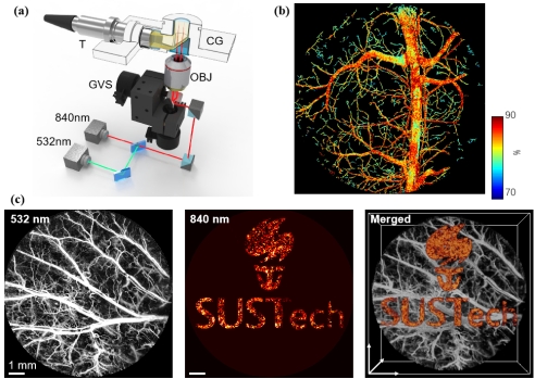 除了获取结构性信息外,光学分辨率光声显微成像技术也能够获取需氧饱和度等功能性信息,此时需要利用生物组织内源发色团对不同波长具有不同吸收率的特性进行多波长成像。在多波长光学分辨率光声显微成像系统方面,团队也有着丰富的开发与集成经验。团队开发了一种采用532nm与840nm激光器作为光源的双波长光声显微成像系统(图15a)。