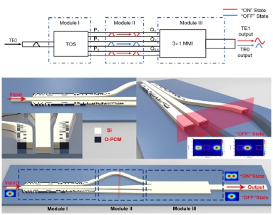2019年在硅和光相变材料混合超结构的平台上提出并设计了一个宽带、非易失性的片上可调谐模式变换器。通过引入能提供足够大的折射率变化的光学相变材料,可以赋予超结构可调谐的功能,并保持紧凑尺寸的优势。当TE0模式被输入到该器件时,其特征可以选择性地切换为保持原始模式或在输出端口转换为另一个模式TE1。