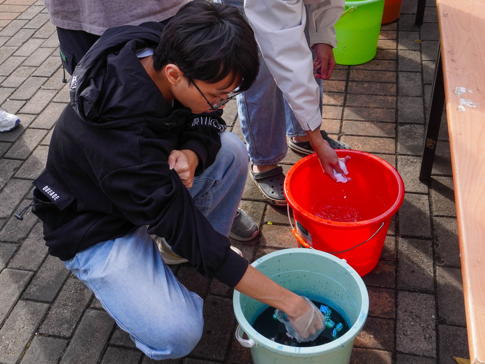 活动现场,四大摊位各展风采。“香启廉心”摊位设置灯谜、香囊二选一体验,同学们或沉吟猜谜,或巧制香囊,让“廉”心在潜移默化中生根发芽;“正义漆扇”摊位由参与者执扇而作,天然漆料在扇面上挥洒,感受千年漆艺从流动到凝固的生命律动;“妙手染青团”摊位上,国家级非遗扎染于此邂逅青春,蓝白相映的图案,是写意在素布上的独一无二的东方诗篇;“拼创未来”摊位将电子元件拆解为模块化拼块,学子们在拼接中感受电子技术的秩序之美,实现科技与非遗的创意融合。