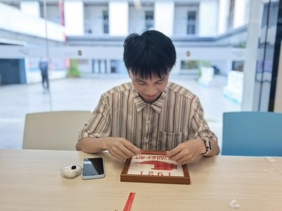 竹编技艺作为国家级非物质文化遗产,凝结着中华文明的工匠精神与智慧结晶。活动第二篇章创新廉洁文化载体,将活动与中华优秀传统文化传承相结合,进行非遗竹编的学习。大家分别编织“南湖红船”“清”“廉”“清廉自律”等主题作品。通过沉浸式体验非遗竹编技艺,引导党员在编织过程中感悟“守规矩、讲细节”的深刻内涵。党员黄韵琪完成编织后表示:“本次主题党日活动让我深刻体会到,在以后的学习生活中要严于律己,关注细节,在生活学习的点点滴滴践行廉洁教育。”